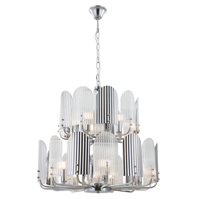 Үй иелері мен коммерциялық кеңістіктерді білуге дайындалған, бұл қос қабат 12 шаммен люкс люкс, теңдестірілген жарықтандыру үшін жарық таразын біріктіреді. Жоғарғы қабат 6 электродельді күміс әйнек реңктері, жұмсақ металл жарқылын көрсетеді, ал төменгі қабатта қытырлақ, жарқын жарық үшін 6 мөлдір кристалды шыныдан жасалған дифференциттер бар. Жоғары жылтыр хромдық рамка заманауи және өтпелі декорларды толықтыратын айна тәрізді жылтыратқышты қосады.