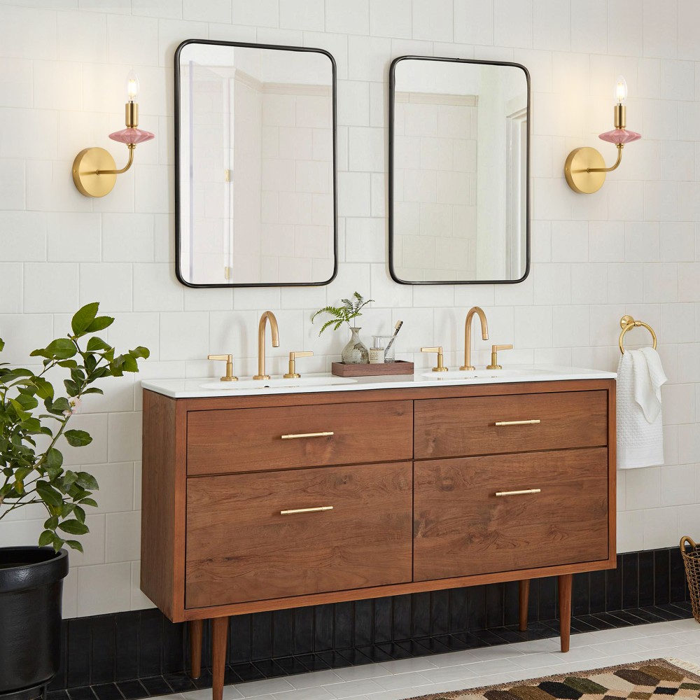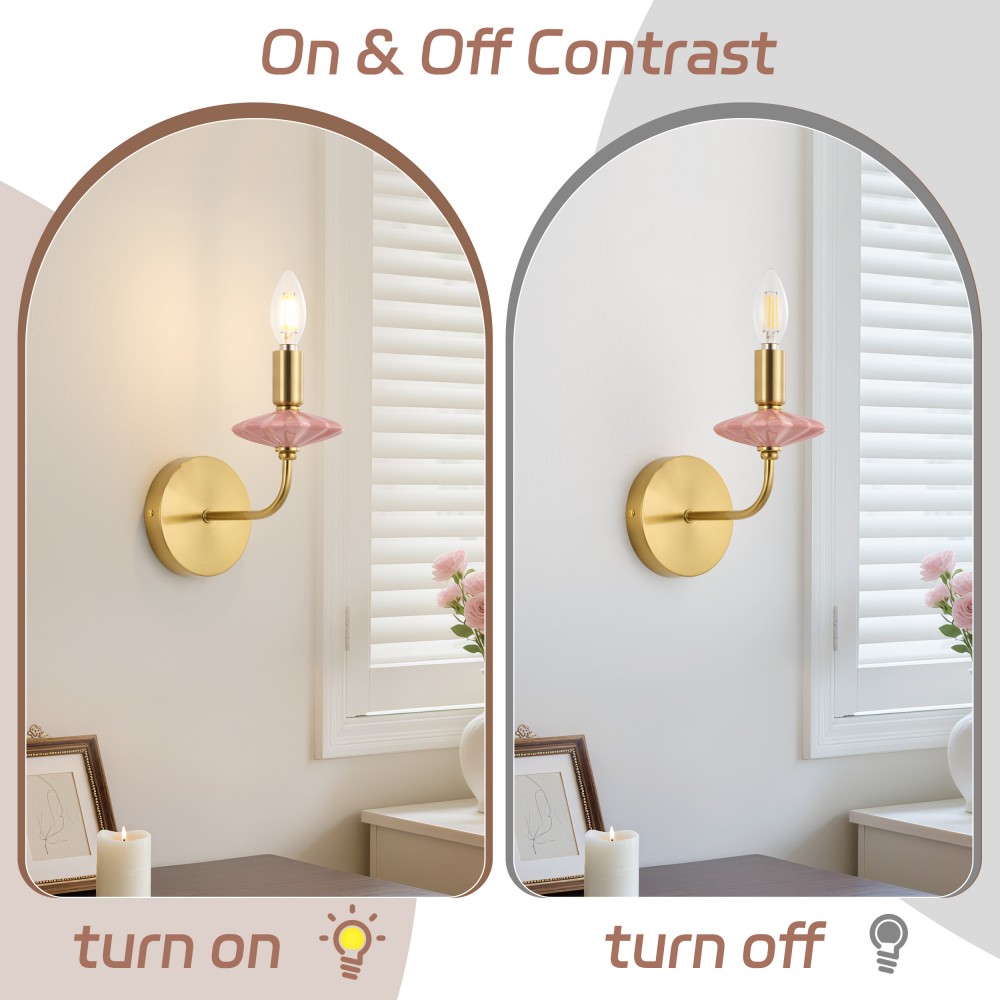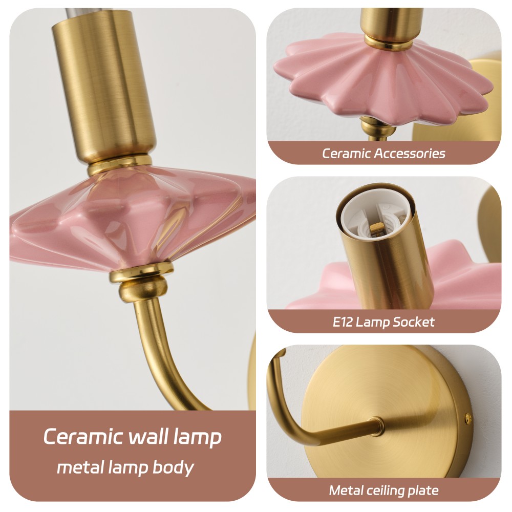 Жұмсақ қызғылт керамикадан және көп қабатты алтын жалатылған жабдықтан жасалған бұл ванна бөлмесінің қабырға шамы классикалық шам пішінін заманауи жеңіл сәнді стильмен үйлестіреді, керамика мен металл материалдарды біріктіретін Strong Lighting шедеврі. Керамикалық бөліктер тегіс жанасу мен өшуге төзімділігі бар жоғары температуралы шынылау арқылы өңделеді, ал алтын жалатылған жабдықтың тотығуға төзімділігі тамаша, тіпті жағалаудағы ылғалды ванна бөлмесінде де ұзақ мерзімді пайдалануға жарамды. E12 розеткасымен жабдықталған ол дәстүрлі және жарықдиодты шамдармен үйлесімді, бір шамға максималды 40 Вт қуатты қолдайды. Жылы және салқын ақ жарықты әртүрлі атмосфераны құру үшін еркін ауыстыруға болады, өлшемдері L200xW110xH210 MM, оның ықшам пропорциясы әртүрлі ішкі қабырғаларға сәйкес келеді.